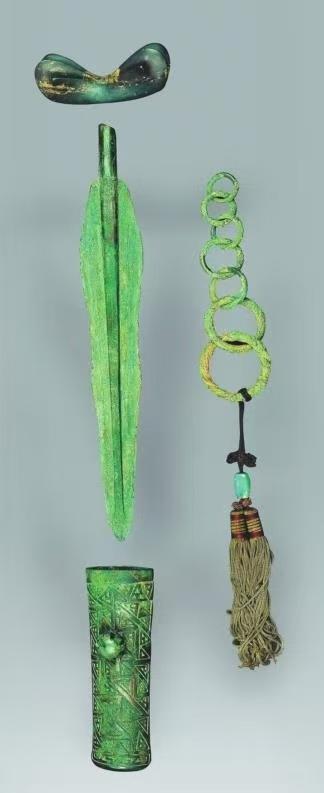 这把青铜短剑是郑家洼子最具代表性的一件文物。剑身曲刃如琵琶,剑柄分体铸造,剑身短且分体设计不利于劈刺,但装饰极尽奢华。其形制独特,与中原一体铸造的直刃剑截然不同,这也印证了辽河流域“借鉴中原技术,发展本土文化”的路径。