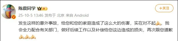 警方发布通报后,陈震发文致歉:我都看到了,是我的问题,一切负面照单全收,全力配合解决问题中,不会有丝毫懈怠,事故经过以官方公告、车辆EDR数据为准,造成了这么大的负面影响,在此向对方车辆道歉,向大家道歉。