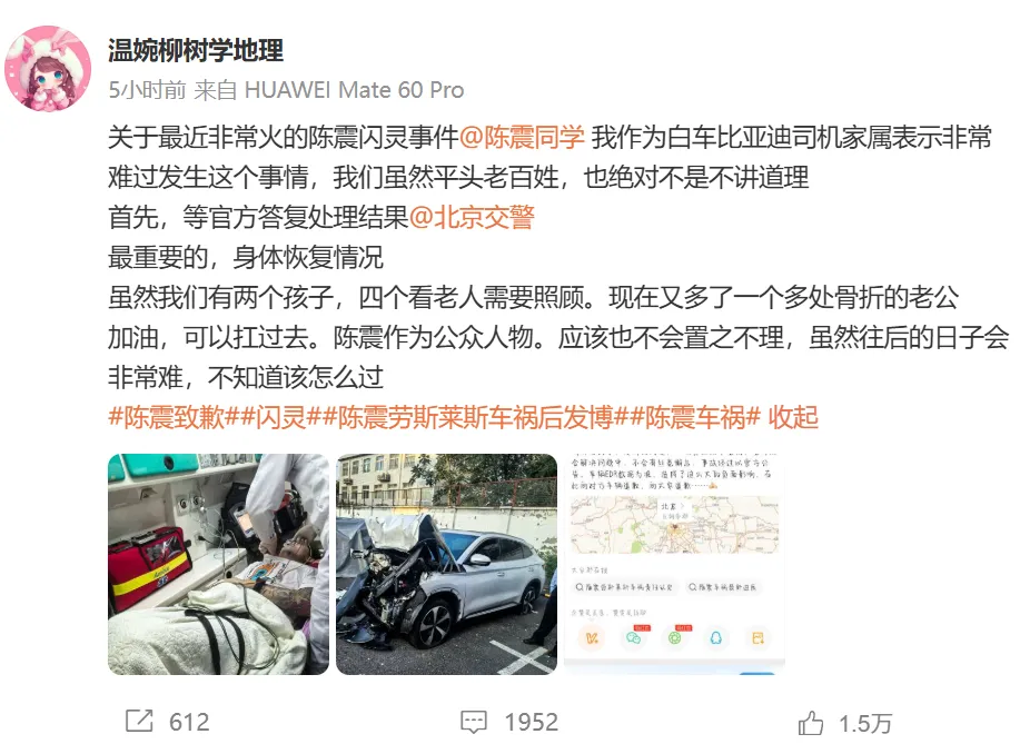 10月5日上午,事故中另一辆受损的比亚迪司机家属发文称,丈夫多处骨折,往后的日子不知道该怎么过。